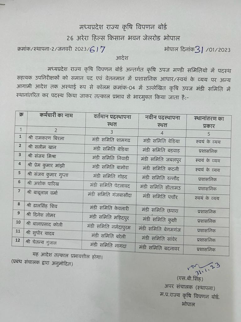 31-01-2023 | श्री उमाशंकर शर्मा-मंडी निरीक्षक, श्री बाबूलाल भिलाला-मंडी निरीक्षक, श्री संतोष कुमार नागर-मंडी निरीक्षक, श्री सुजान सिंह भंवर-मंडी निरीक्षक, श्री कदम सिंह-मंडी निरीक्षक, श्री फूलसिंह जाटव-मंडी निरीक्षक, श्री प्रताप सिंह राजपूत- मंडी निरीक्षक, श्री सुरेन्द्र कुमार भिलाला-मंडी निरीक्षक, श्री रामेश्वर मेडा-मंडी निरीक्षक, श्री नवल सिंह रघुवंशी-मंडी निरीक्षक, श्री विनय भार्गव-प्रति. मंडी निरीक्षक, श्री गोपाल सिंह अहिरवार-मंडी निरीक्षक, श्री विश्वास ज़ोन-मंडी निरीक्षक, श्री दिनेश लोखंडे-मंडी निरीक्षक, श्री हरिनारायण भिलाला-मंडी निरीक्षक, श्री सुनील कुमार तिवारी-मंडी निरीक्षक, श्री देवेन्द्र सिंह ठाकुर-मंडी निरीक्षक, श्री भगवत सिंह चौहान-मंडी निरीक्षक, श्री शेर बहादुर सिंह-मंडी निरीक्षक, श्री राजेन्द्र कुमार धनोरिया-मंडी निरीक्षक | Download |