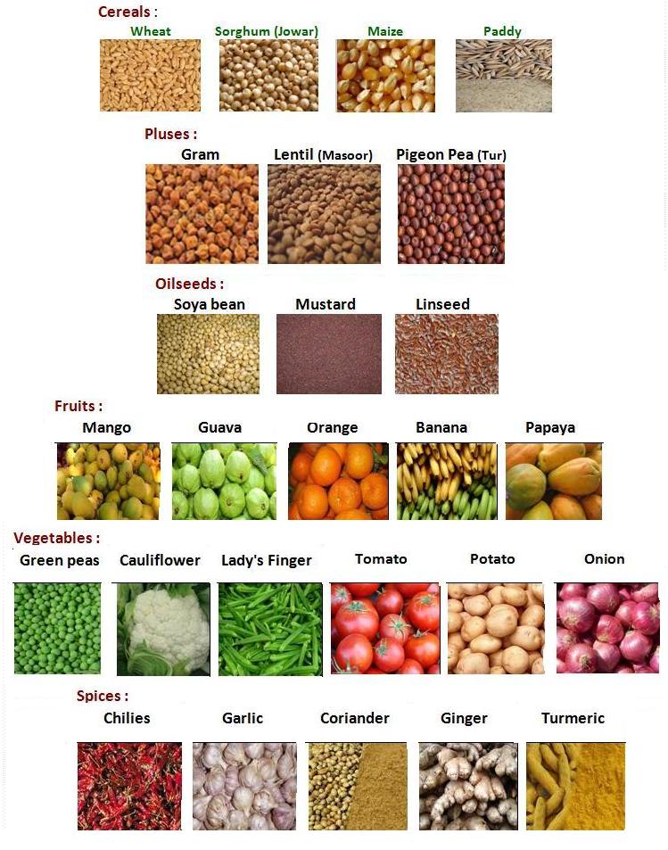 - प्रदेश की प्रमुख खरीफ फसलें सोयाबीन, धान, मक्का, तुअर ‘‘अरहर‘‘ मूंग, उड़द, ज्वार, बाजरा, तिल, कपास है साथ ही प्रमुख रबी फसलें गेहूं, चना, मटर, मसूर, सरसों, अलसी है जबकि प्रमुख उद्यानिकी फसलों में, फलों में आम, अमरुद, केला, संतरा, पपीता वहीं सब्जीयों में आलू, प्याज, टमाटर, मटर और मसालों में धनिया, मिर्च, लहसून के अतिरिक्त फूल एवं औषधी भी शामिल है।